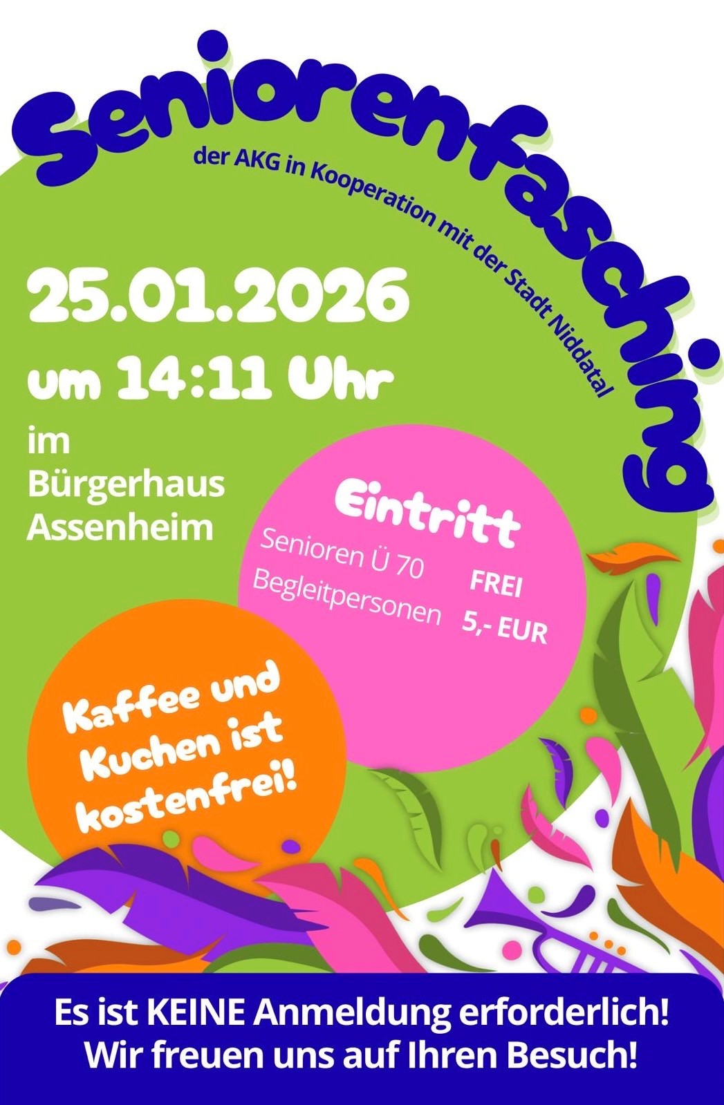 Am Sonntag, den 25. Januar 2026, lädt die Assenheimer Karnevalsgesellschaft „Verein Humor 1914 e.V.“ in Kooperation mit der Stadt Niddatal herzlich zur Seniorenfaschingssitzung im Bürgerhaus Assenheim ein. Die Veranstaltung beginnt um 14:11 Uhr und verspricht ein unterhaltsames Programm mit karnevalistischen Darbietungen. Für das leibliche Wohl der Gäste ist ebenfalls gesorgt: Kaffee und Kuchen werden von der Stadt Niddatal kostenfrei bereitgestellt.