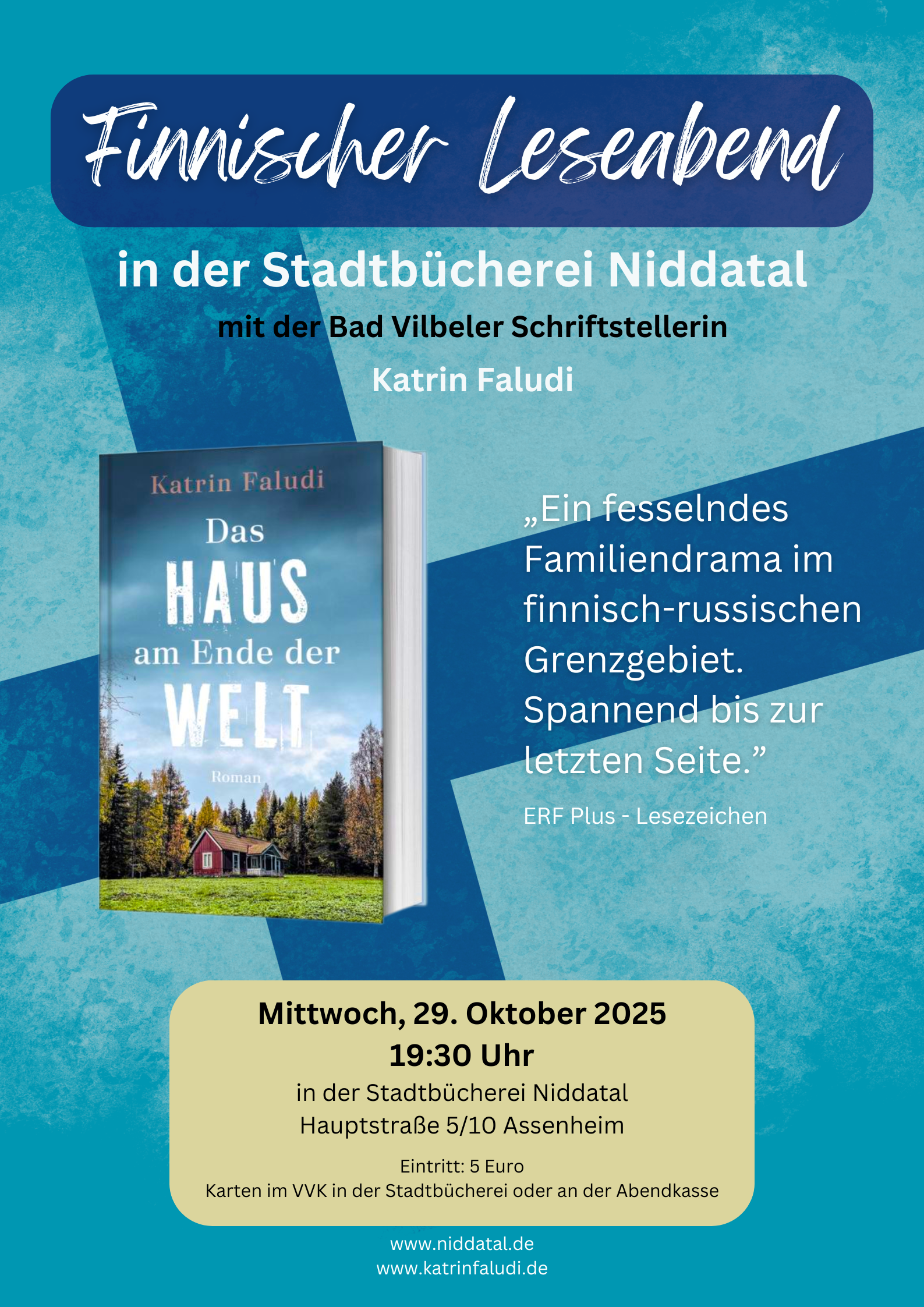 Am 29. Oktober 2025 um 19:30 Uhr lädt die Stadtbücherei Niddatal zu einer besonderen Lesung ein. Die Bad Vilbeler Schriftstellerin Katrin Faludi wird aus ihrem neuen Werk "Das Haus am Ende der Welt" vorlesen. Dieses fesselnde Familiendrama spielt im finnisch-russischen Grenzgebiet und verspricht, die Zuhörer in eine bewegende Geschichte zu entführen, die von den Herausforderungen und Geheimnissen innerhalb einer Familie erzählt.
