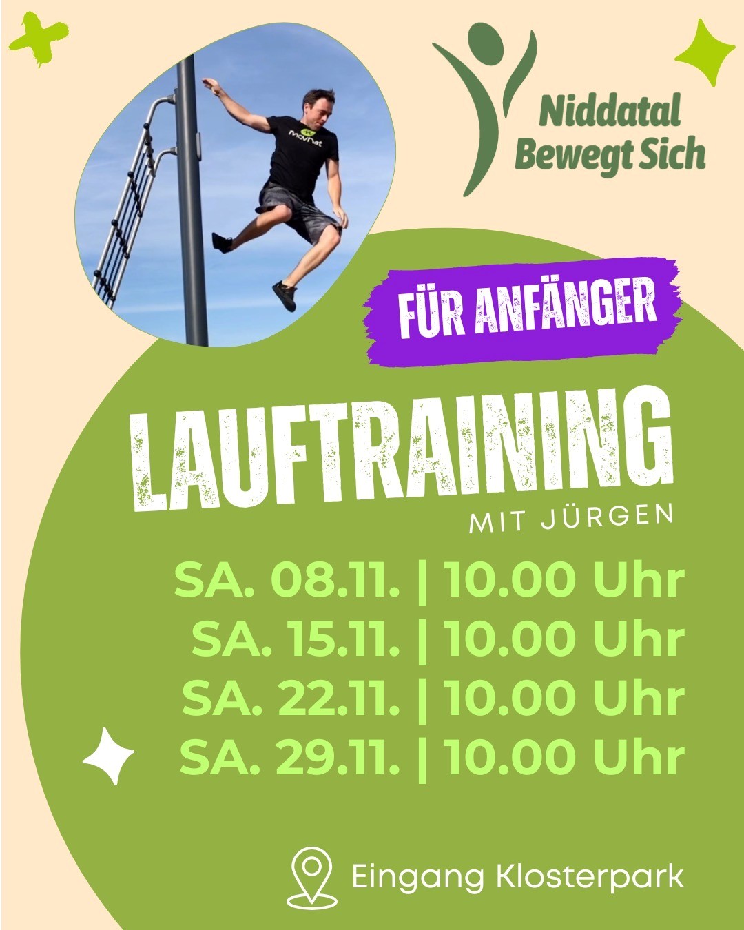 Ab dem 08. November 2025 bietet Jürgen von der Initiative Niddatal bewegt sich ein Lauftraining für Anfänger an. Die ersten Trainings finden jeden Samstag im November um 10 Uhr statt. Diese Initiative richtet sich an alle, die Interesse daran haben, ihre Ausdauer zu verbessern und Spaß an der Bewegung in der Natur zu finden.